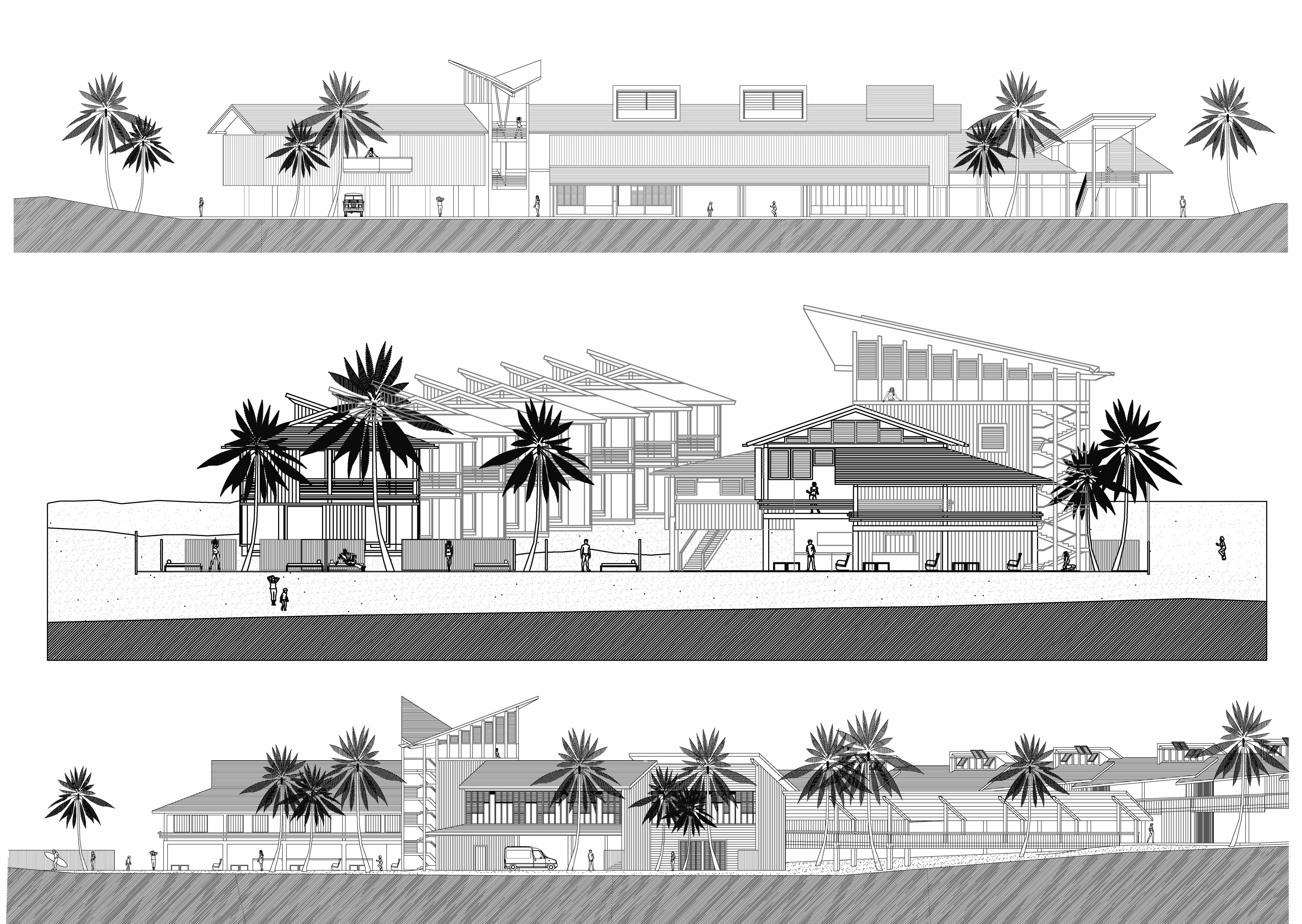 En este caso dibujé las fachadas de un hotel aterrazado de madera, ubicado sobre los médanos de una playa brasilera. Vemos algunas imágenes: