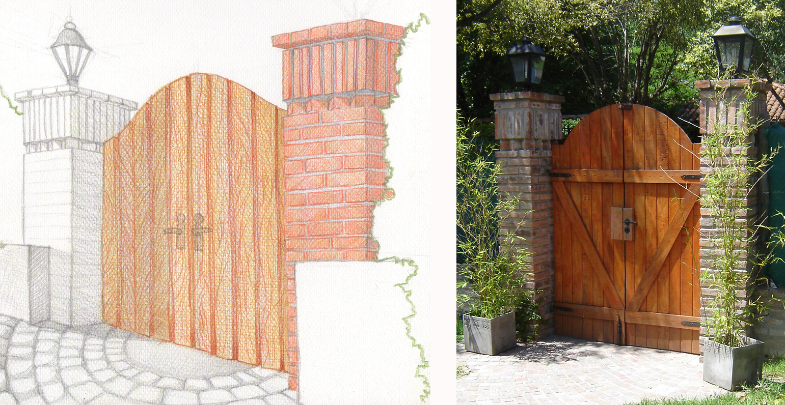 Tomé como punto de partida la geometría de las tejas coloniales, curva y sensual. El acceso peatonal se resolvió con un portón de madera terminado en arco, flanqueado por dos “tótems” de ladrillo visto, coronados por sendos faroles estilo colonial. También colocamos un solado de acceso de pórfido y un umbral de quebracho en la entrada que quedaron muy bien. Aquí vemos una imagen del primer croquis y de la obra final: