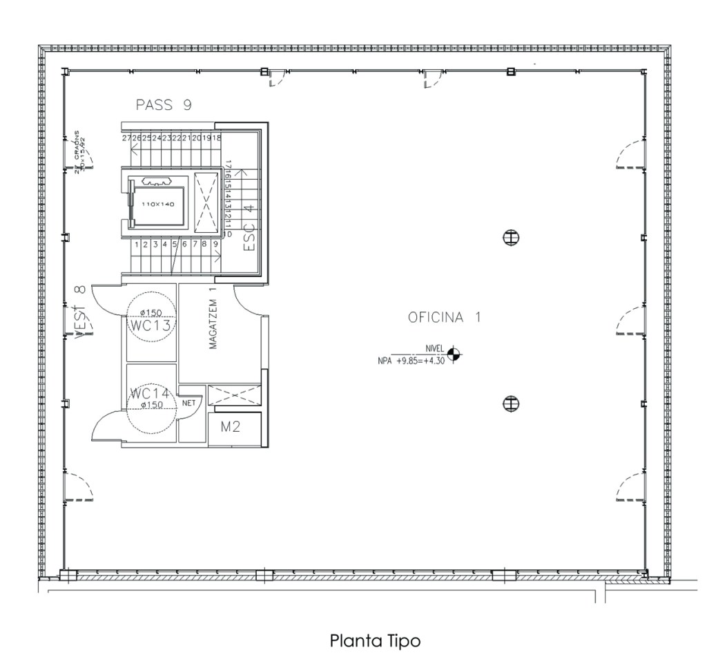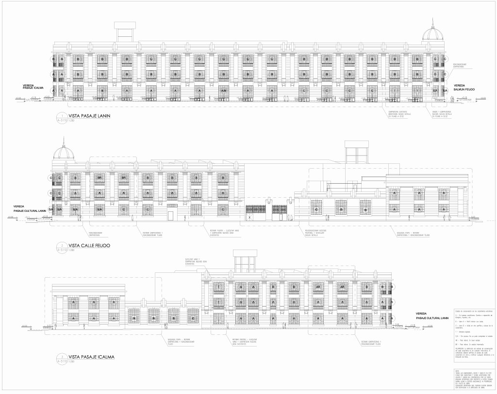 Plan principal del edificio de oficinas y detalles de la fachada.