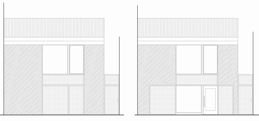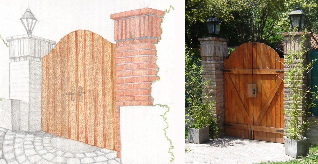 Dibujo conceptual y foto del diseño terminado de la nueva puerta del jardín.
