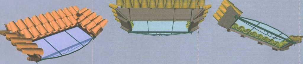 Renders en 3D de conceptos, planos y foto de la entrada terminada con techo de policarbonato y estructura metálica.